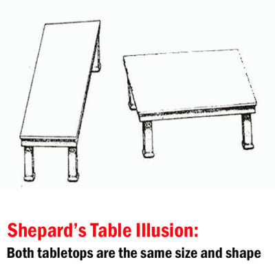 Shepard tables (aka Turning Tables) is an optical illusion first presented by Stanford psychologist Roger N. Shepard in his book Mind Sights (1990). The two table tops look as if they have different shapes, with the one on the left appearing long and thin and the one on the right appearing approximately square shaped. In actuality, aside from a rotation of 90 degrees, the tops are identical.